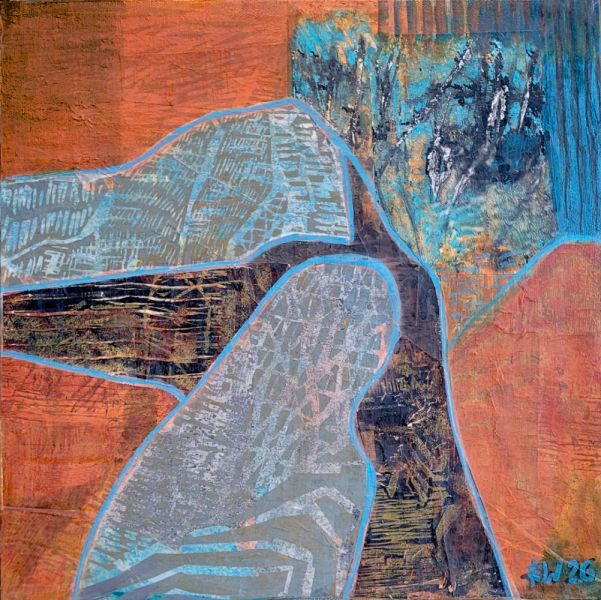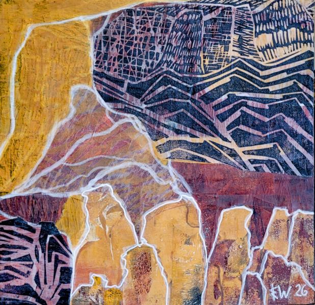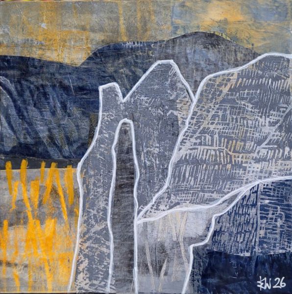The outlines and the colours as well as the contrasting barrenness and abundance of the Okanagan Valley are recurring characteristics which I like to rework in my paintings. Using different techniques and mixed media, I approach the landscape through a process of simplification which distills and intensifies its essence. I enjoy working in linocut on paper to make original prints and monoprints as well as mixed media and collage on canvas and on cradled wood. Since 1996 my work has been shown in several solo and group exhibitions in public and commercial art galleries, formerly exhibiting at Tumbleweed Gallery and now at The Lloyd Gallery in Penticton.