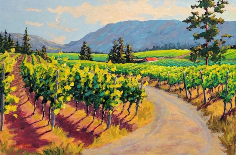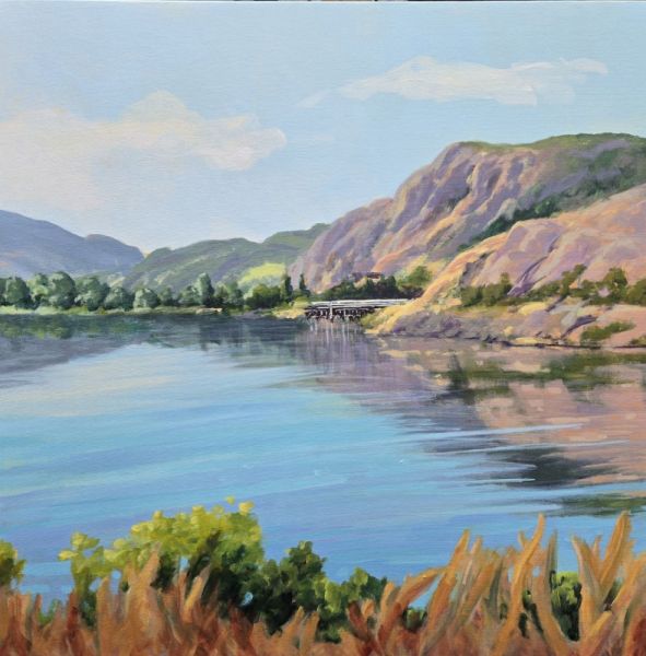 Robyn had her first solo exhibition of watercolours in Penticton 1996. Since then she has moved to painting with oils and acrylics and has continued to develop her representational style, varying her subjects from intimate close up views of flowers and fruit, to panoramic views of the landscape.