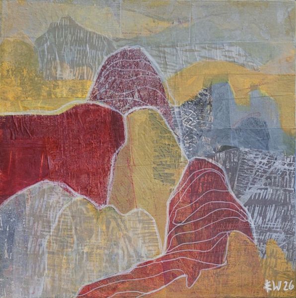 The outlines and the colours as well as the contrasting barrenness and abundance of the Okanagan Valley are recurring characteristics which I like to rework in my paintings. Using different techniques and mixed media, I approach the landscape through a process of simplification which distills and intensifies its essence. I enjoy working in linocut on paper to make original prints and monoprints as well as mixed media and collage on canvas and on cradled wood. Since 1996 my work has been shown in several solo and group exhibitions in public and commercial art galleries, formerly exhibiting at Tumbleweed Gallery and now at The Lloyd Gallery in Penticton.