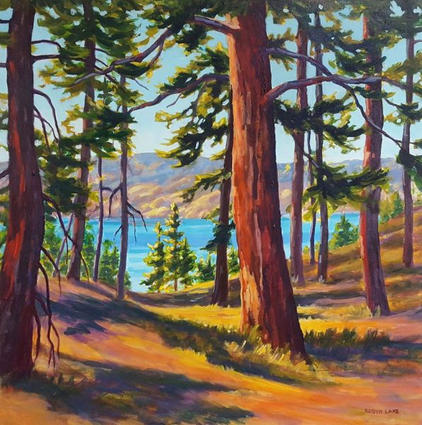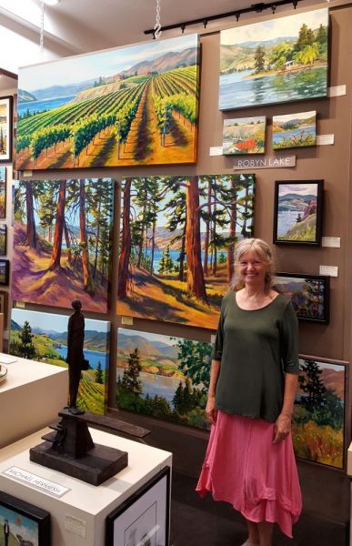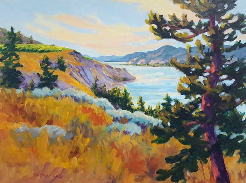 Robyn Lake had her first solo exhibition of watercolours in Penticton 1996. Since then she has moved to painting with oils and acrylics and has continued to develop her representational style, varying her subjects from intimate close up views of flowers and fruit, to panoramic views of the landscape.